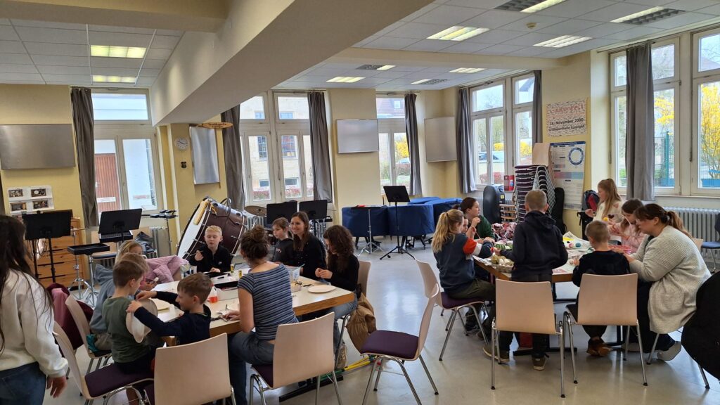 Kurz vor den Osterferien trafen sich die Musikerinnen und Musiker der Bläserbande und der beiden Schülerorchester mit den Jugendleiterinnen und weiteren Betreuerinnen im Proberaum, um gemeinsam Eier zu bemalen und bunte Osterdekoration zu basteln. In fröhlicher Atmosphäre entstanden dabei viele kreative Kunstwerke – von klassisch bemalten Ostereiern über bunte Fensterbilder bis hin zu selbst gestalteten Osterkörbchen. Die perfekte Einstimmung auf die Osterferien. Solche gemeinsamen Aktionen sind neben den regelmäßigen Proben von großer Bedeutung. Sie stärken den Zusammenhalt innerhalb der Gruppe, fördern das gegenseitige Kennenlernen und schaffen Erinnerungen, die weit über das gemeinsame Musizieren hinausgehen. Auf diese Weise wachsen Gemeinschaft und Teamgeist – beides wichtige Grundlagen für ein harmonisches und erfolgreiches Zusammenspiel.